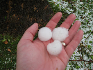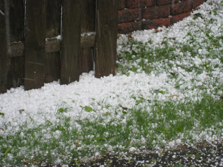 There was some torrential downpours around church, but nothing too destructive. So when the storm had passed, Evie and I proceeded home and were stuck on the freeway due to several s. I kept seeing all this white stuff on the ground and I thought it was blossoms from the trees that the winds had just blew off. I didn't think much beyond that because the sun was shinning and the sky was totally clear. Then when we get the exit near our home I realize that the white stuff is not blossoms, it's marble - golf ball size hail!!!! Our block looked like a hurricane had hit it. Houses where dented in, windows broken, limbs down, leaves plastered over everything! So yes, the brand new beautiful siding that we just had replaced in the winter is now dented and will need to be replaced! We calling our insurance people today. This has been a crazy spring for storms!