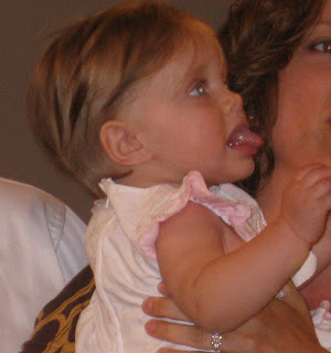 Everyone has been to either a Baby Dedication or Baby Baptism before right? You know how there are categories in which the babies typically fit into... For example: the scared baby, the crying baby, the quiet/observant baby, the smiley baby, the sleeping baby. Well, my daughter has created a new category....the noisy/sticking out tongue baby! She stuck her tongue out of her mouth for the entire ceremony and would not stop talking! It was too funny! I kept pushing her tongue back in her mouth, but to no avail! It kept coming back out. The congregation got a kick out of it.