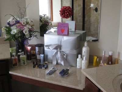 Christian has done two really special things for me lately. (He does great things for me all the time, but these two we extra special). A few weeks before the move I was loosing it! I was so stressed and tired and I just needed a break with peace and quiet. He kicked me out of the house for 24 hours and sent me to a fabulous hotel & spa. I took a nap, had a Tai massage, watched a movie and ate room service in a king size bed. I had the whole bed to myself!! It was amazing!! It really gave me the extra "umph" that I needed to make it through the home stretch (no pun intended). The other fabulous thing he did was an amazing house warming present. You should see the picture posted, but it consisted of several lotions, bath care products, facial products, new makeup, tea, perfume, flowers, and "the softest robe that you will every feel in you life!" I have never had a vanity since we've been married and have always complained that I didn't have any wear to put my curling iron and hair dryer. Oh, and I've broken countless bottles of skincare products and eye shadows that would send me fuming!! Well, now since I have a vanity he wanted to enjoy the experience with all new stuff and let me tell you, "He did good!"
